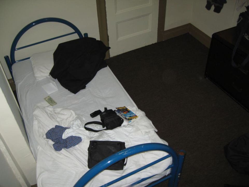 Etwas hart aber zweckmäßig.Daneben nicht sichbar eine Komode mit Schubladen und ein an der Wand montierter Fernseher mit ausreichenden Kabelprogrammen