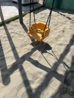 Kinderschaukel hängt leider sehr tief. Und die Ketten sind angemalt. Davon löst sich die Farbe und geht an Kinderhände. Sowas geht nicht!