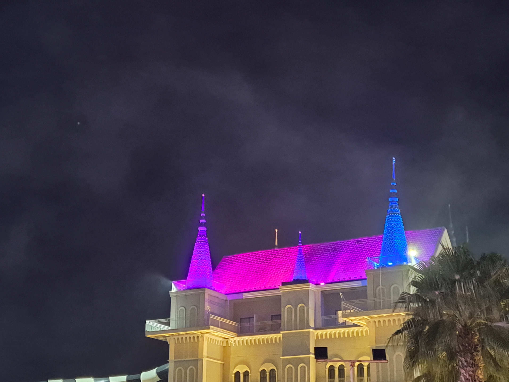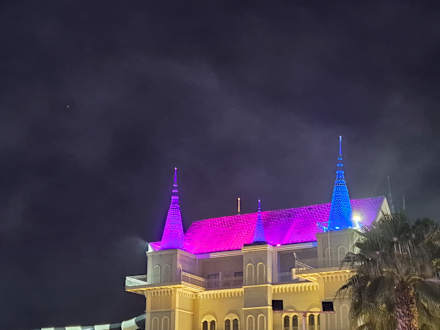 Abends beleuchtetes Dach des großen Rutschenturms
