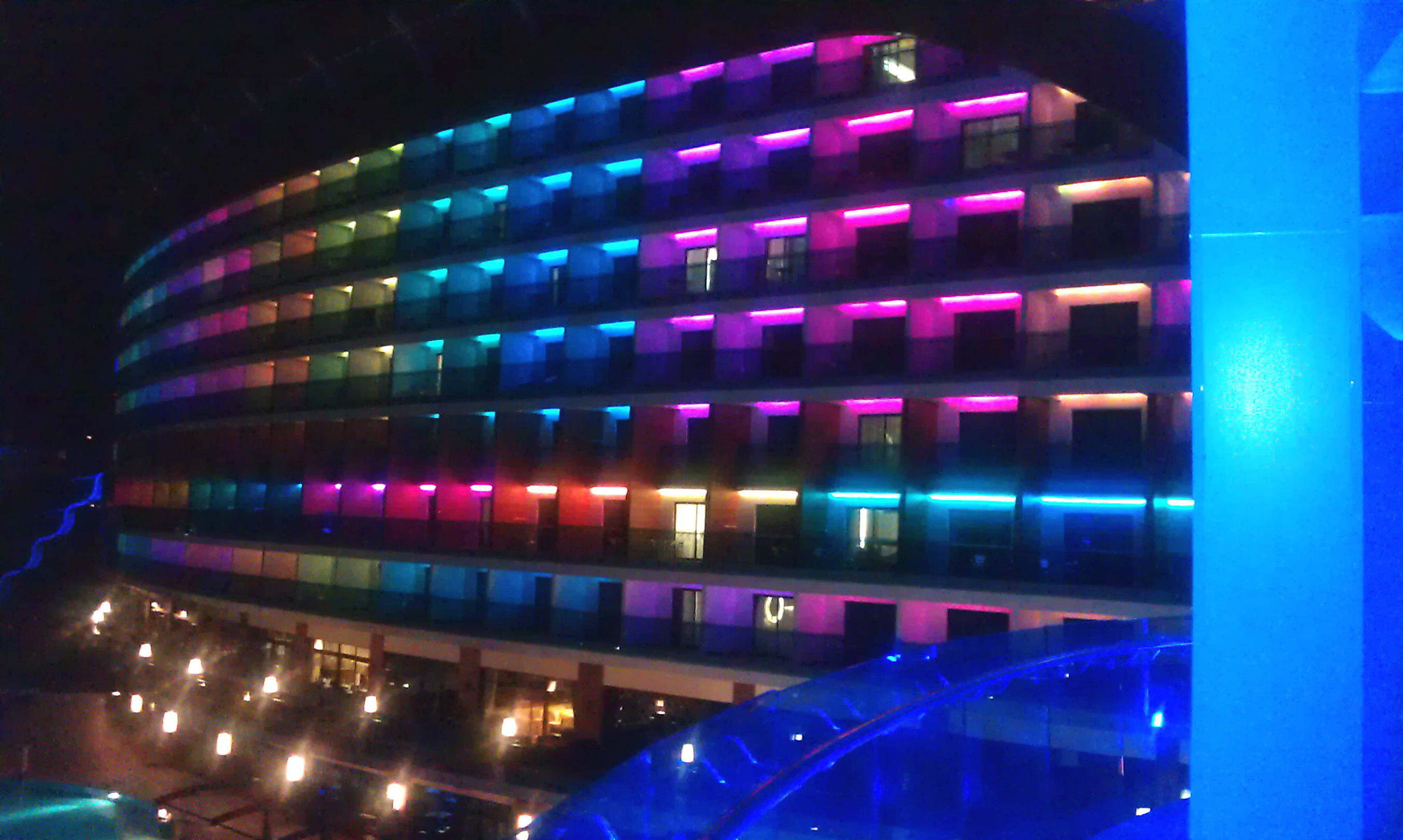 Abends ist jeder Balkon wechselnd beleuchtet