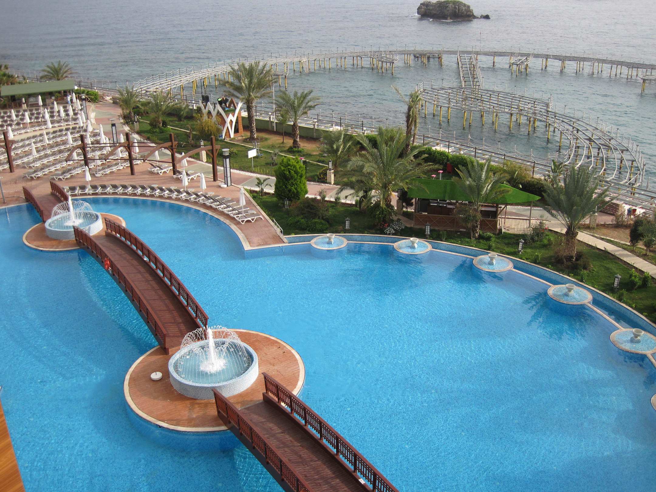 Ausblick vom Zimmer auf die gepflegte Poolanlage
