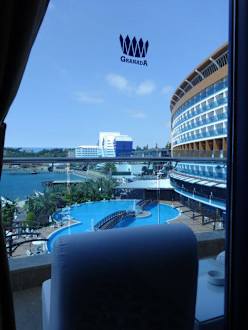 Blick zum Pool von der Lobbybar