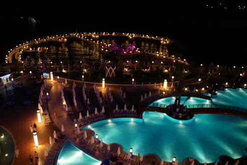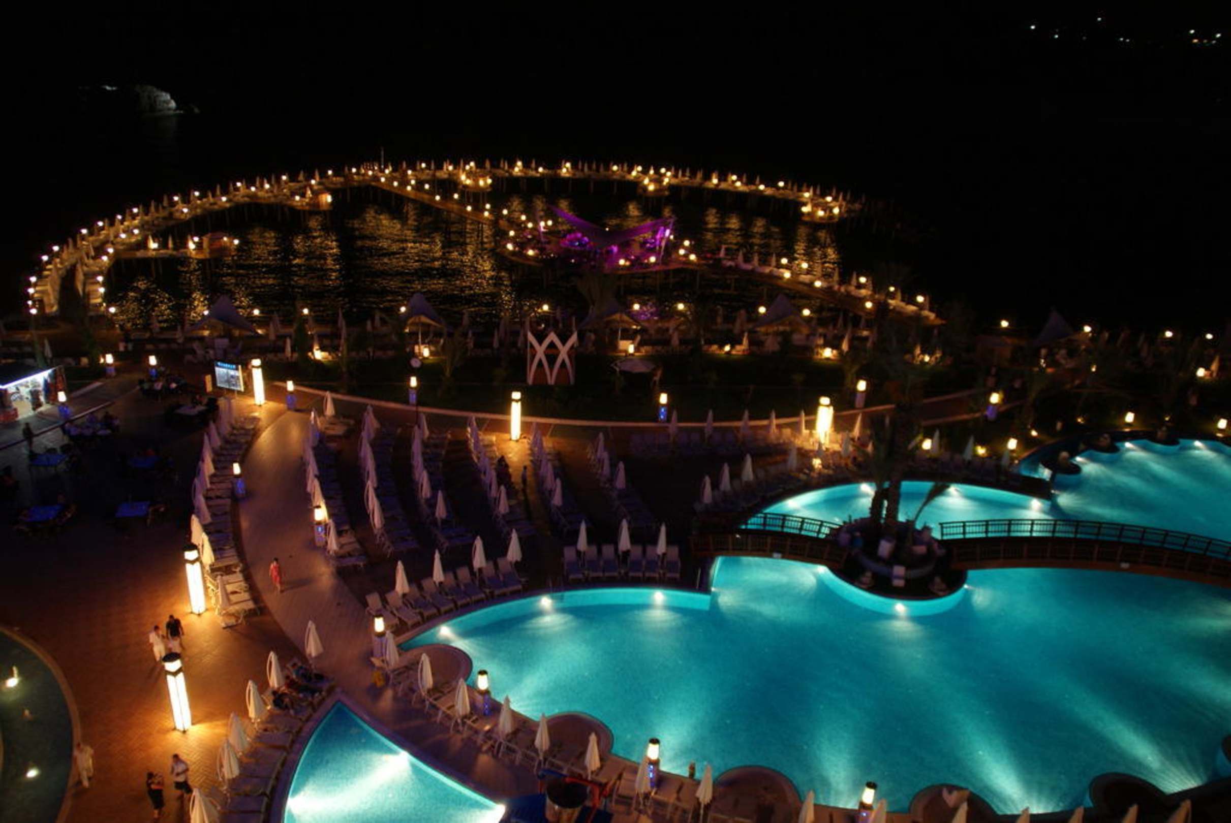 Poolanlage mit Steg bei Nacht