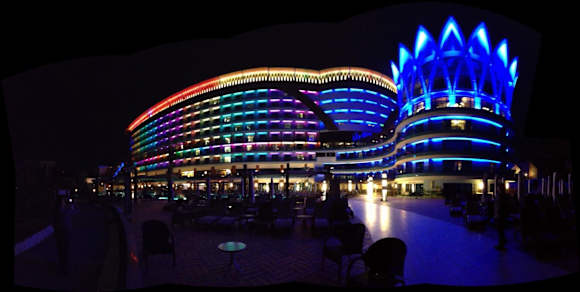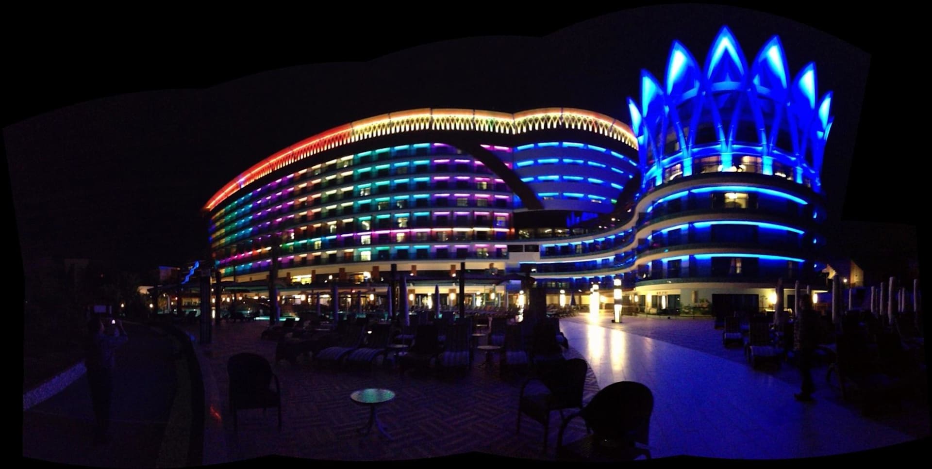Wenn es dunkel wird gibt es eine schöne Außenbeleutung mit Farbwechsel. Diese wird etwas später aber auch wieder abgeschaltet so dass man in Ruhe schlafen kann. Die Beleuchtung des Hotels setzt komplett auf LED und Energiesparlampen.