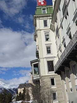 Von ferne erkennt man das Hotel an der Schweizerfahne auf dem Dach des Hauptgebäudes.
