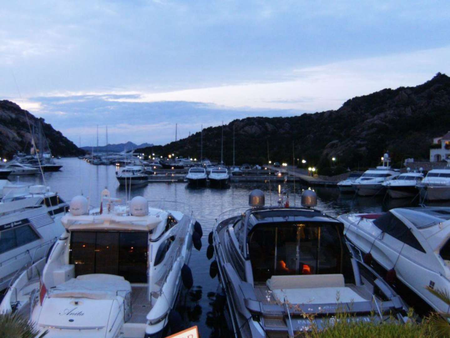 Hafen von Poltu Quatu bei DämmerungVom Hotel bzw. dem Quai aus sieht man den Hafen und im Hintergrund das La Maddalena - Archipel (hier bei Dämmerung)