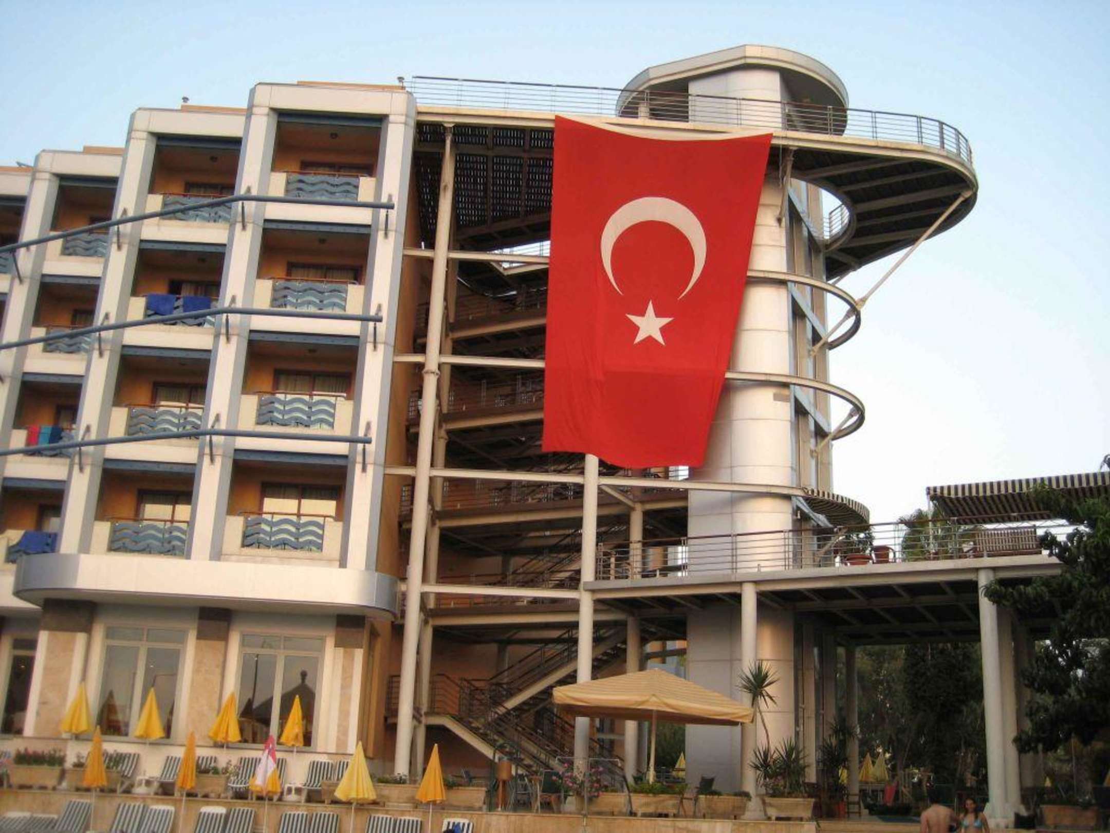 Zimmer mit Aussichtpunkt auf Dachterasse. Das Hotel ist als Schiffsform gebaut. Hier: Bug des Schiffes mit wunderbaren Panorama auf Alanya.