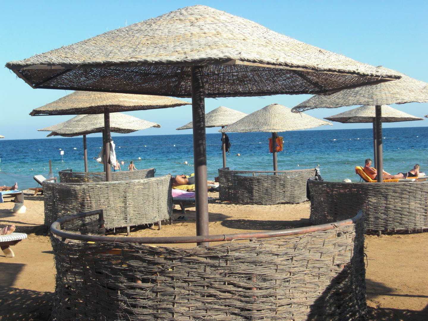 Die Liegen am Strand mit Sonnenschirm sind gegen den Wind geschützt