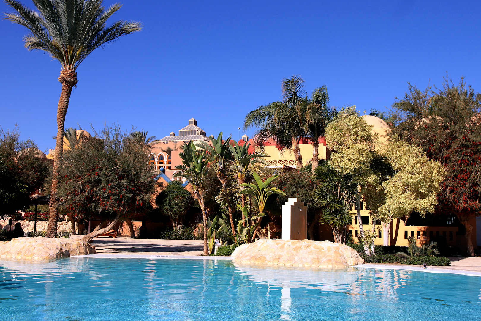 Pool mit Blick Richtung Rezeptionsgebäude (siehe auch herrliche Flora)