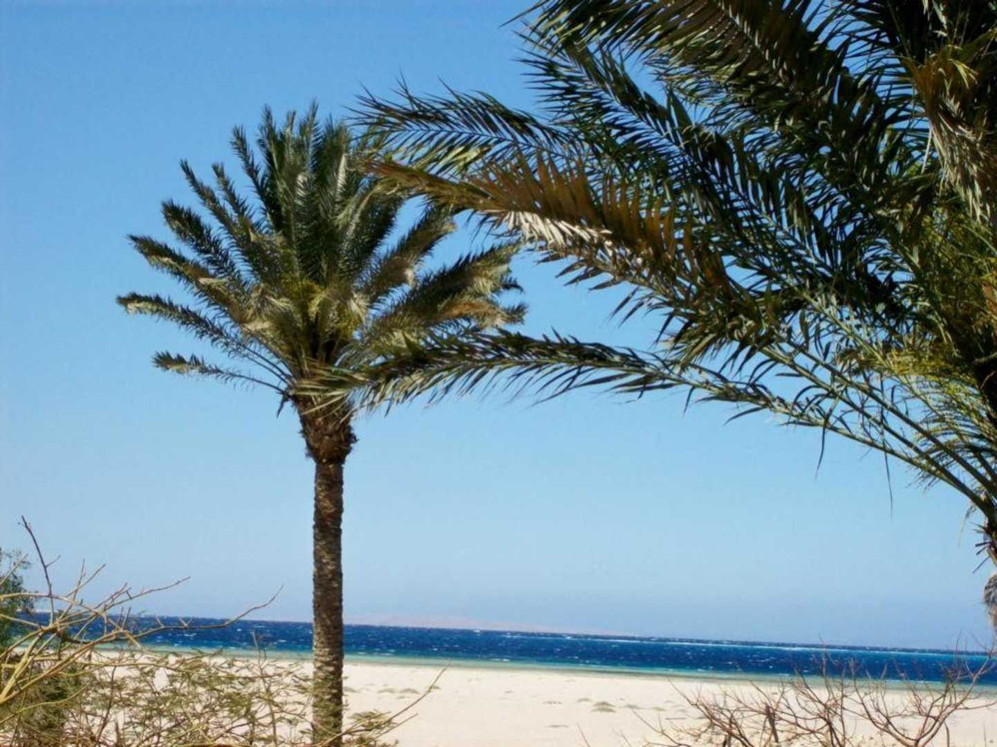 Der seitliche Ausblick von unserem Zimmer auf Palmen und Meer.