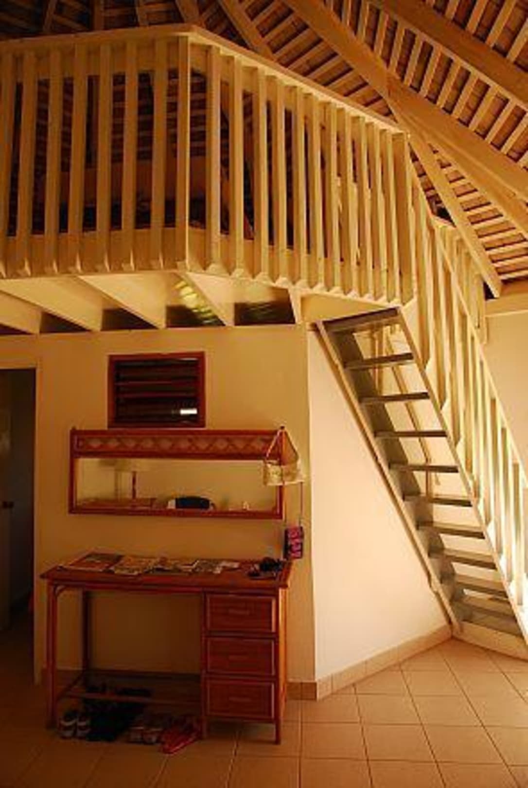 Bungalow innenDie einzigen Schubladen im Bungalow und die Treppe nach oben zum zweiten Schlafraum.