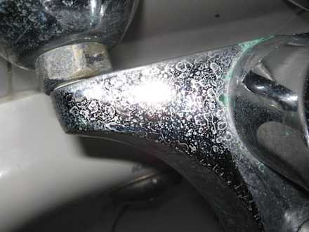 Badewanne, verkalkte Armaturen mit Grünspan