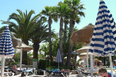 Liegen, Sonnenschirme und Palmen beim Pool