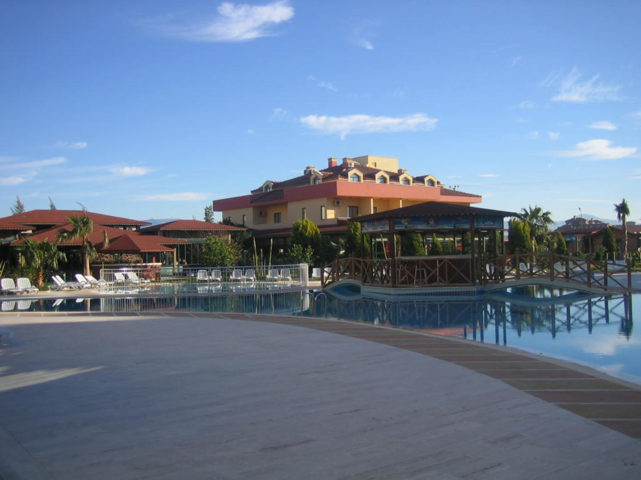Pool und im Hintergrund das großzügige Restaurant des Hotels.