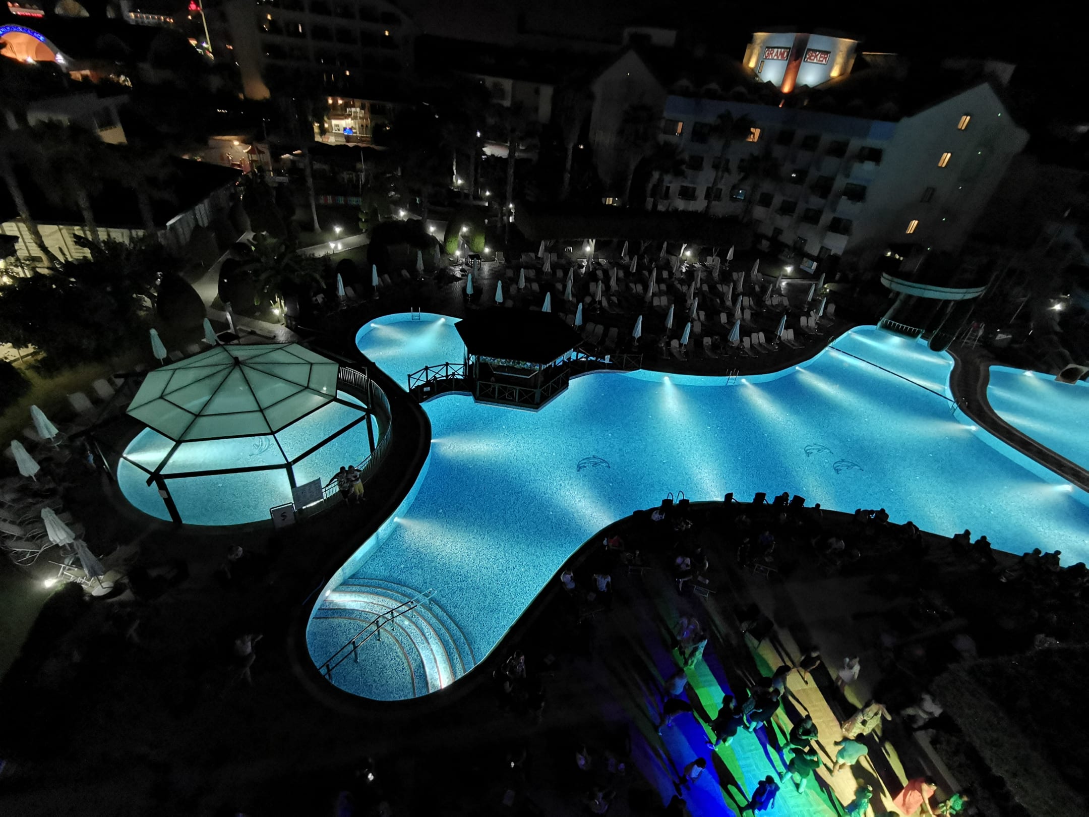 Aktivitätenpool mit Open Air Disco bei Nacht