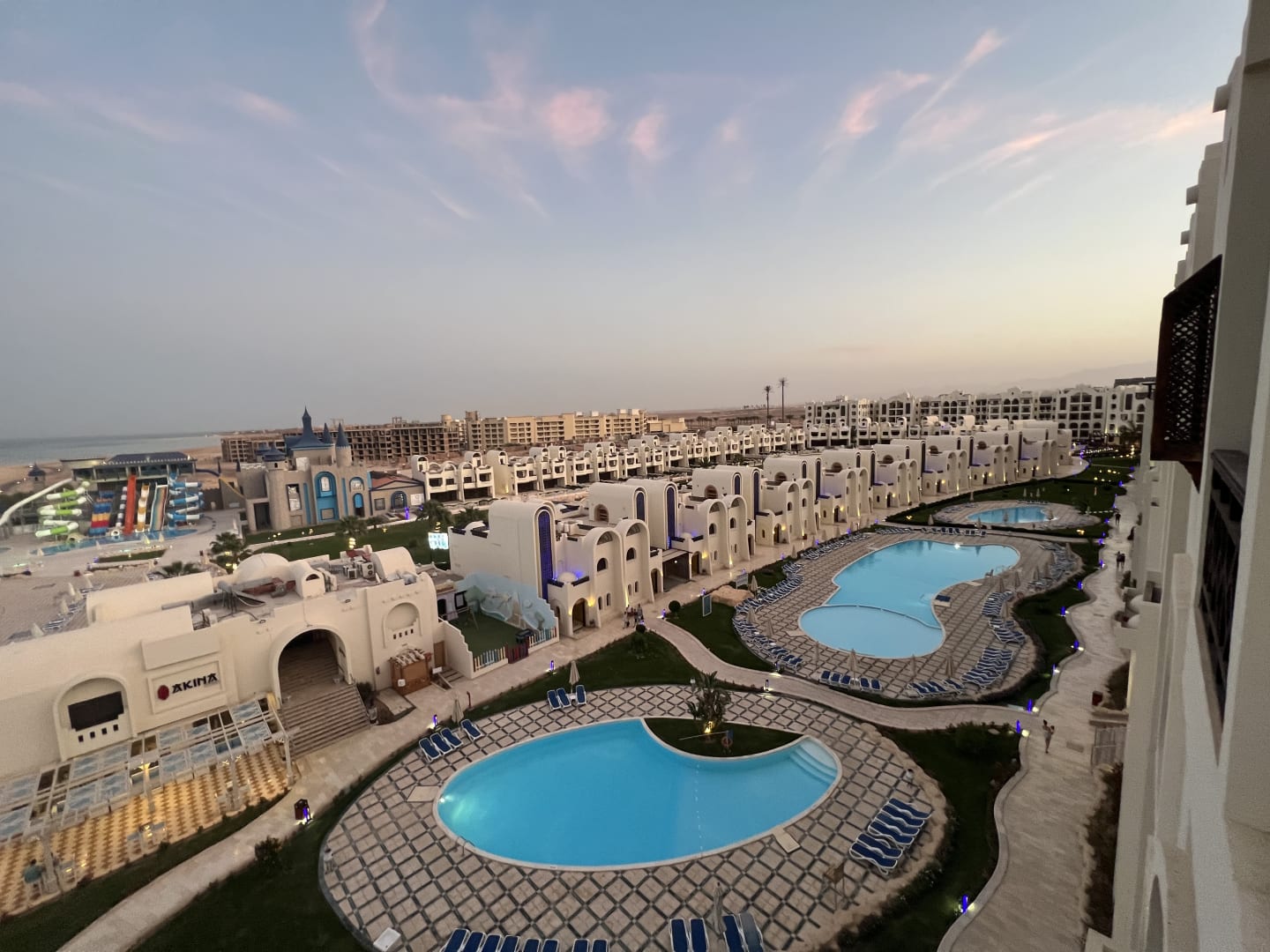 Schöne Aussicht über die Pools. Musik wurde zur Animation am vorderen Pool gespielt. Also für jede was dabei. Im Hintergrund sieht man links die Aqua Park Anlage.