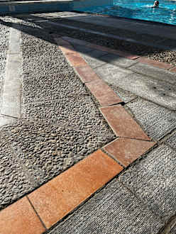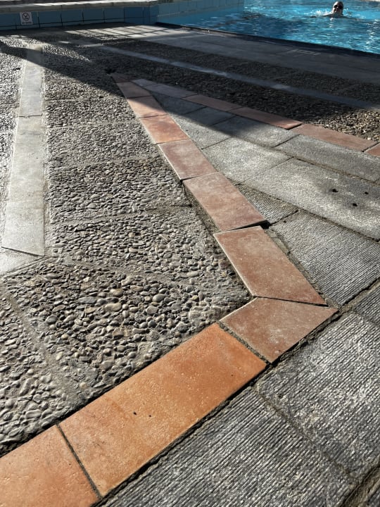 Lose Fliesen, spitze Fliesenkanten, nicht einladender Pool mit dreckigen Fliesen/Fugen