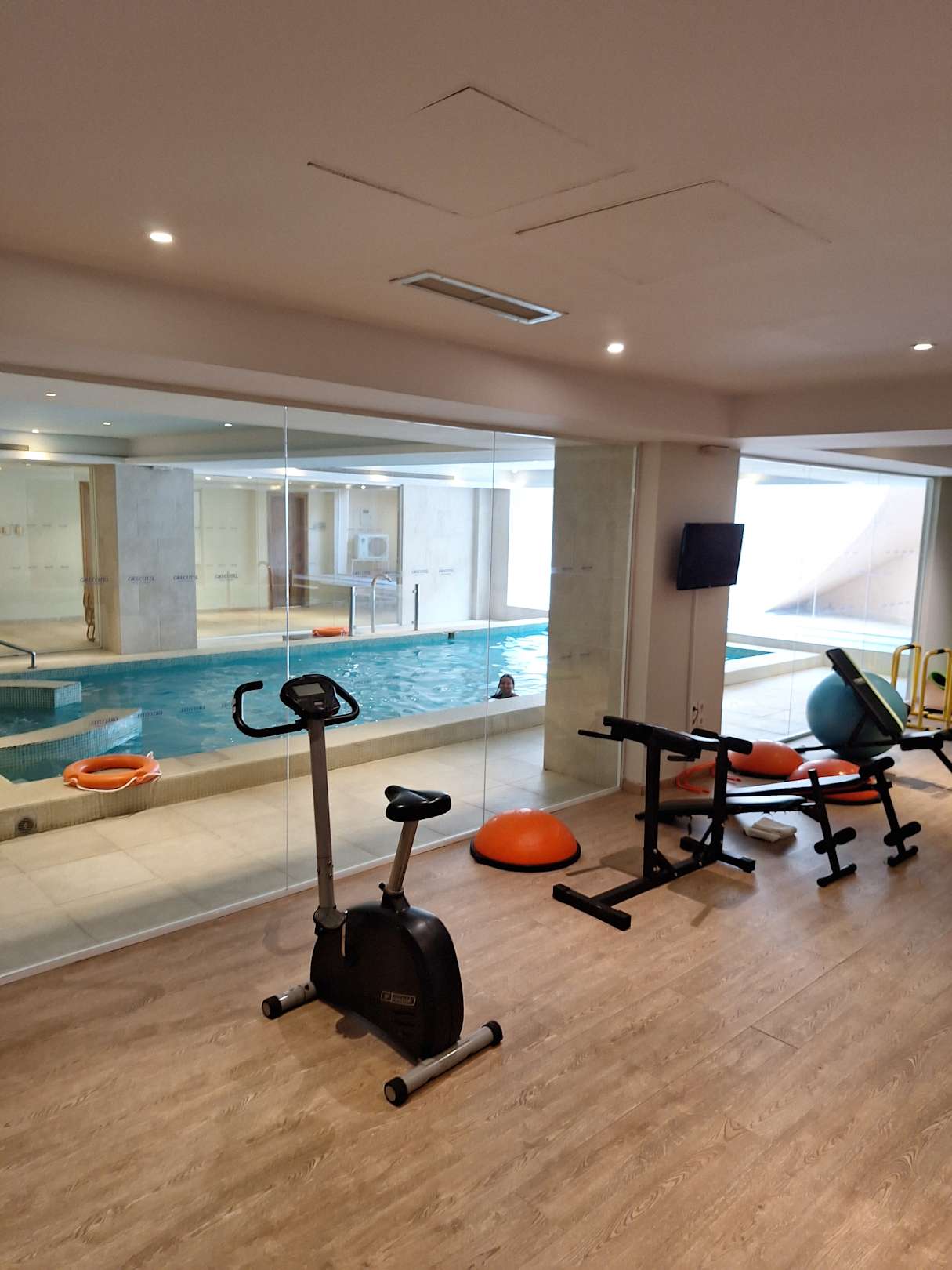 Fitnessbereich mit Blick auf den Indoorpool