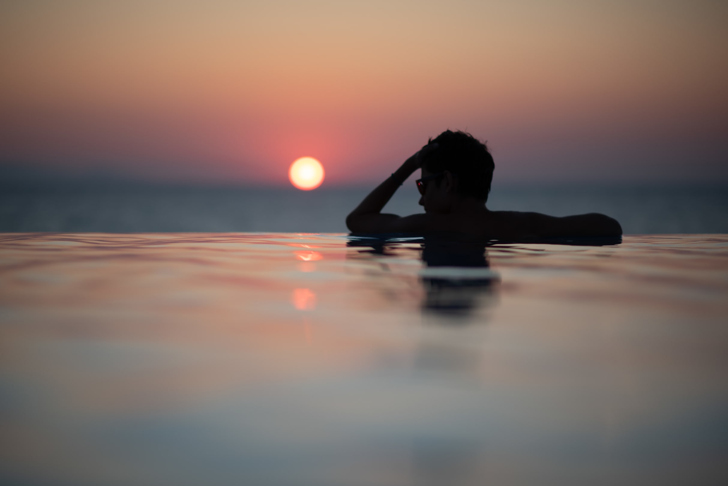 Mein Sohn wollte unbedingt dieses Foto. Also rein in den Pool und hoffen, dass der Sonnenuntergang gut wird. Dieser war außergewöhnlich klar. Das Foto wurde nicht bearbeitet! (Nikkor 85 mm, 1.4)