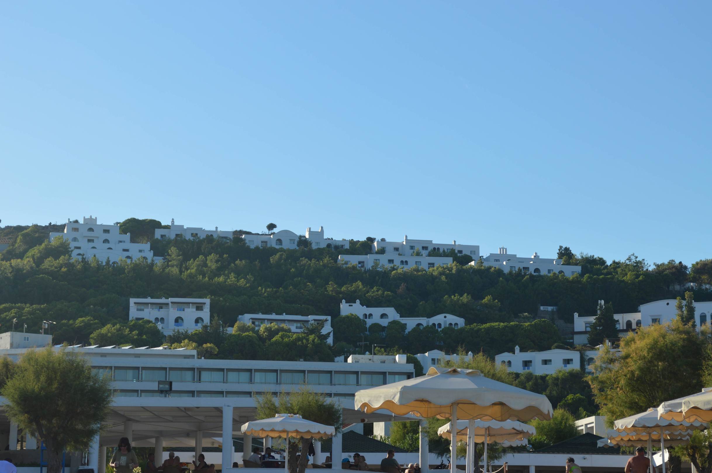 Blick vom Strand auf Hotel und Umgebung