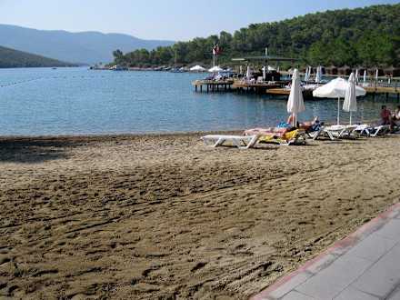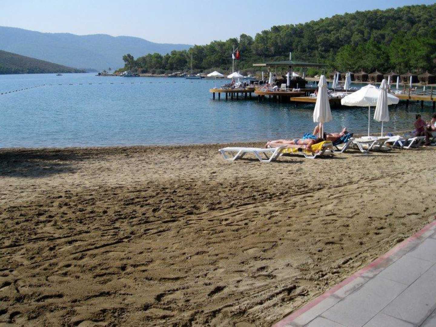 StrandDer sogenannte Sandstrand...Sand bis zur Wasserlinie und danach spitze kleine Steine.Ohne Badeschuhe geht da gar nix!!!