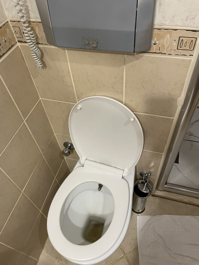 Dreckige Toilette und abgegriffener, klebriger Spülknopf, aus dem die Weichmacher austraten.