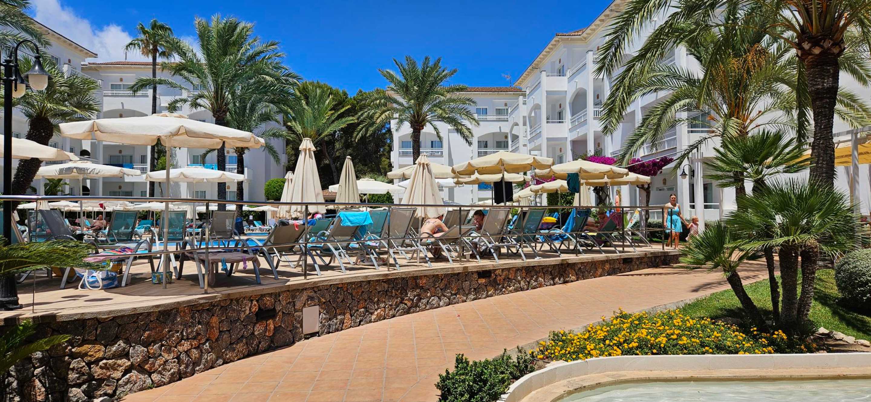 GartenanlageZugang zum Poolbereich mit etlichen Liegen (Liegen sind leider teilweise schon abgenutzt, mit eingerissenem Gewebe)