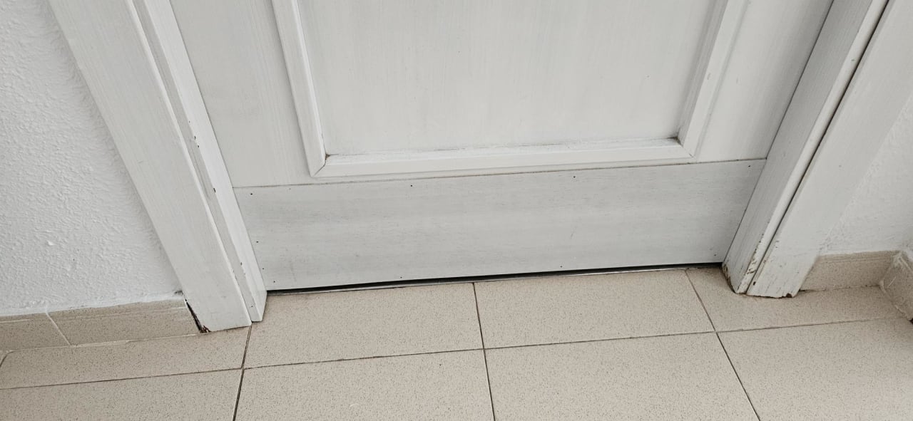 ZimmerUnterer Türbereich Duschbad - aufgequollen vom Duschwasser, geflickt mit Furnierplatte