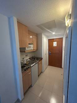 Die Küchenzeile und daneben der Kleiderschrank.