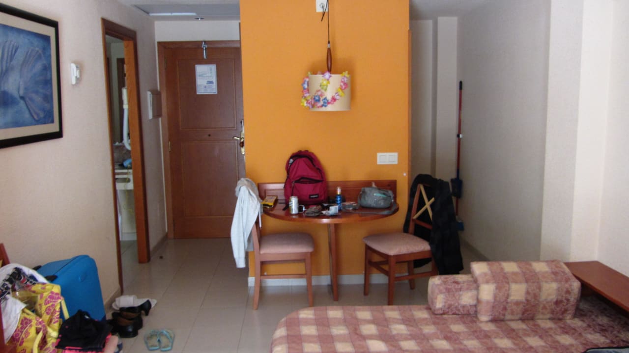 Links Zimmertür, rechts Kochecke