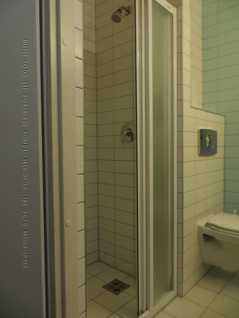 Blick ins Bad zur Duschkabine.