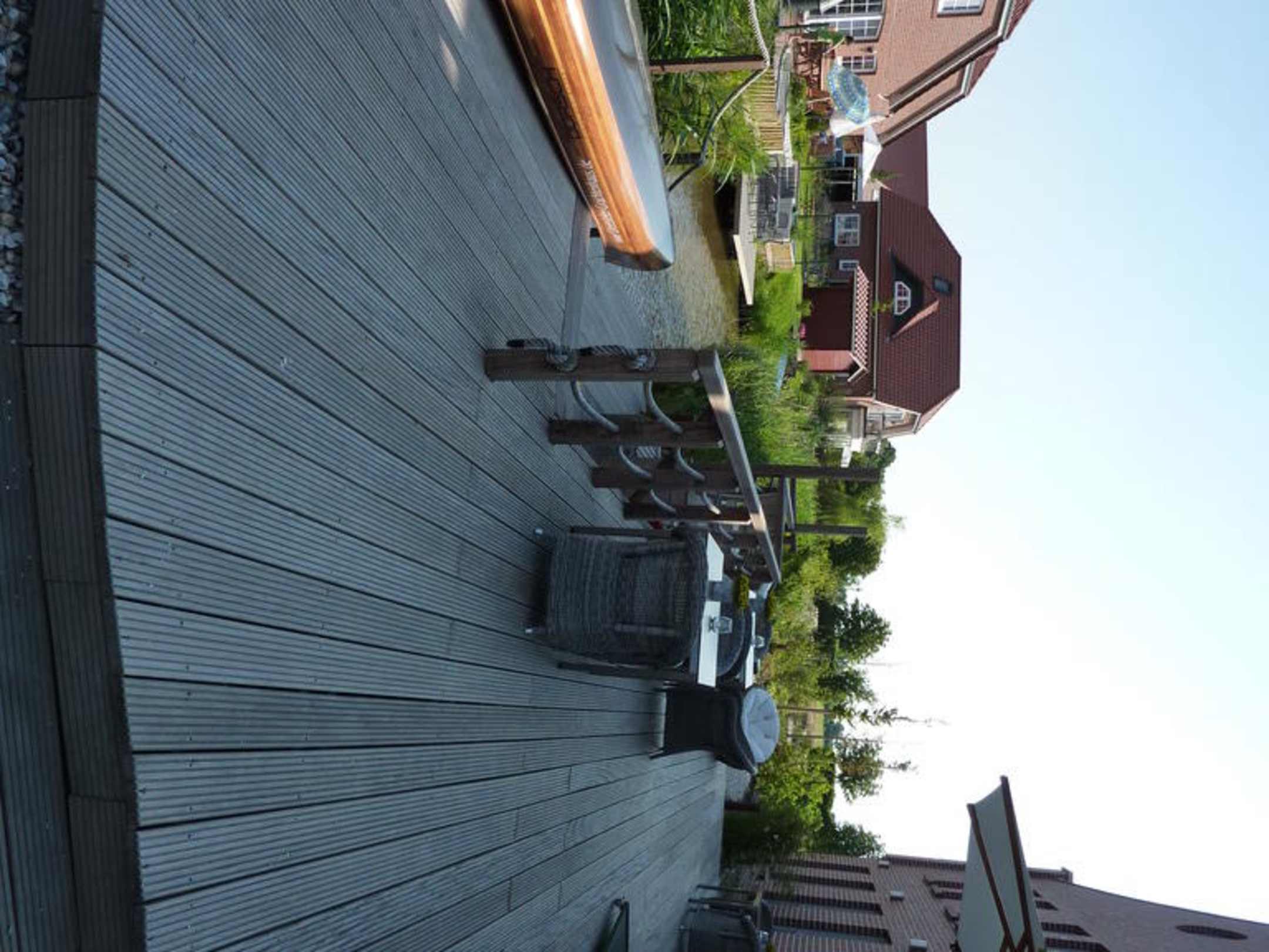 Terrasse hinterm HausHier kann man abends schön sitzen, direkt am Sielausläufer... oder morgens schön frühstücken.