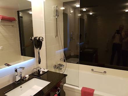Das Badezimmer ist recht wertvoll ausgestattet.
