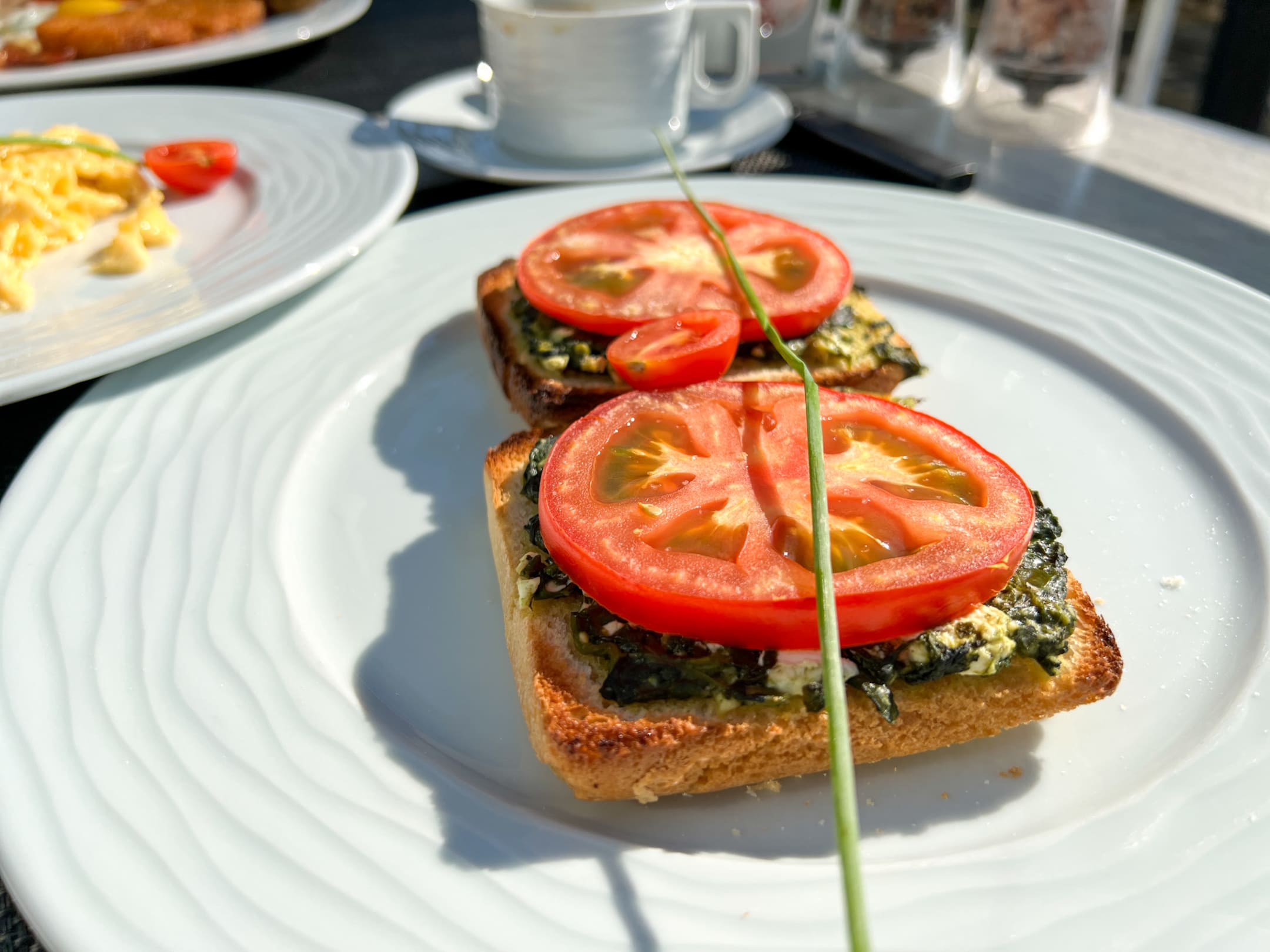 Frühstücksspecial mit Toast, Spinat, Bulgarischen Käse und Tomate.