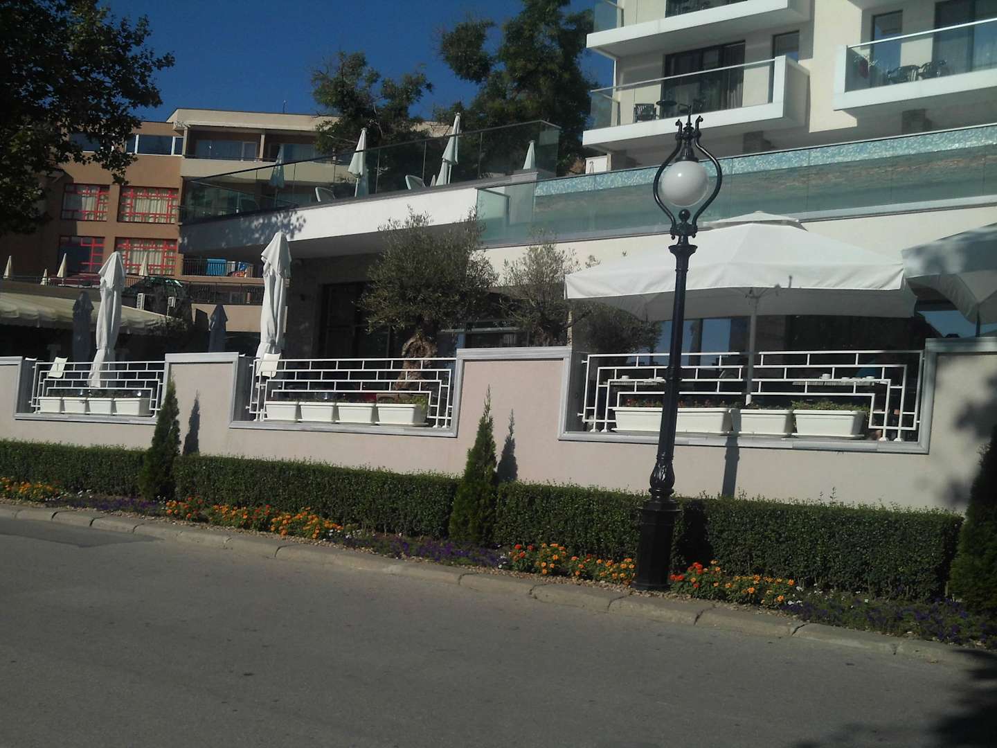 RestaurantterrasseBlick von der anderen Straßenseite auf die Terasse auf der im Hauptrestaurant gegessen werden kann.