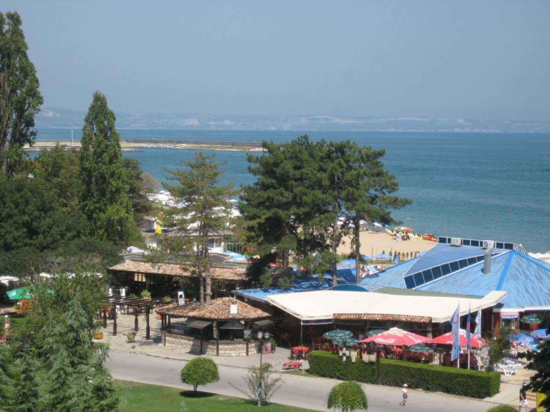 Blick vom Balkon auf Promenade und das Meer
