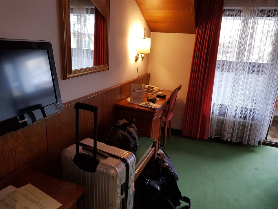 Links der leider sehr kleine Fernseher, hinten ein Schreibtisch.