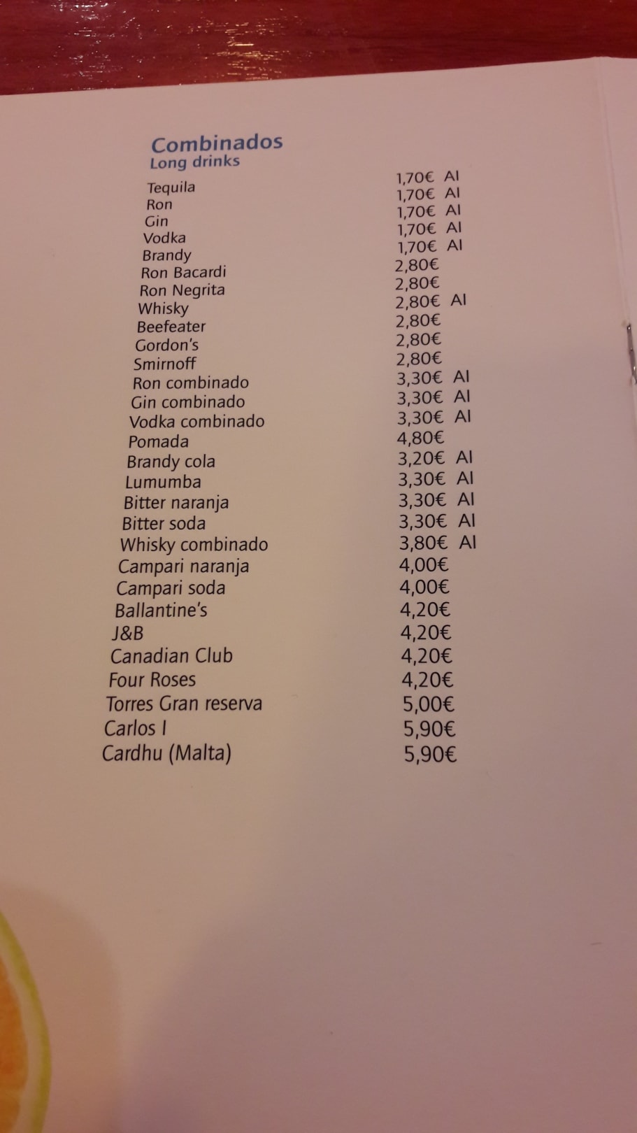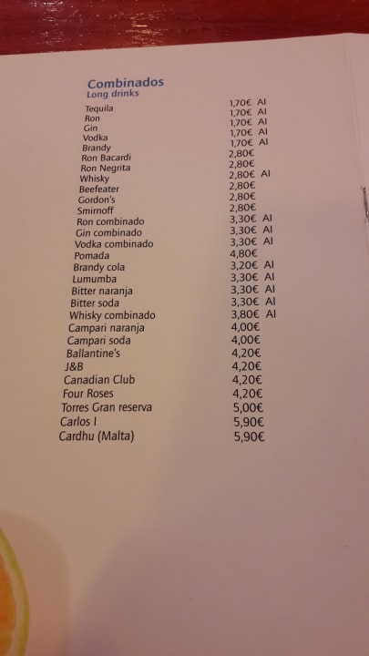 Teile der Getränkekarte