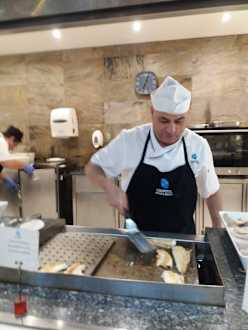 Koch der frischen Fisch brät