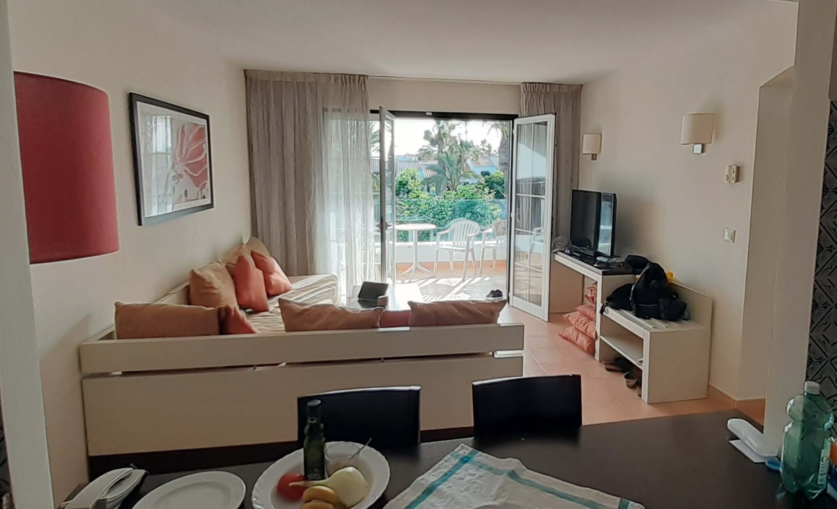Blick in unser Appartement aus der offenen Küche aus gesehen