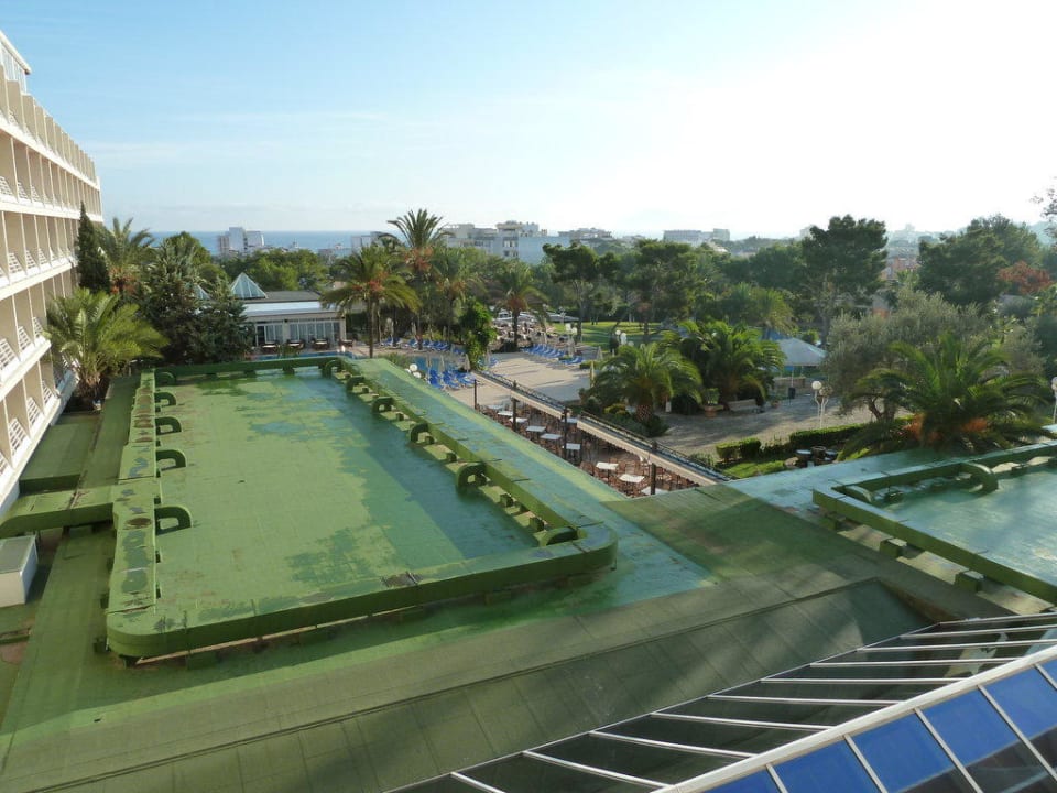 Blick aus dem Zimmer 370Blick vom Balkon auf die grünen Dächer der Speisesäle und Pool, in Richtung Straße und Meer