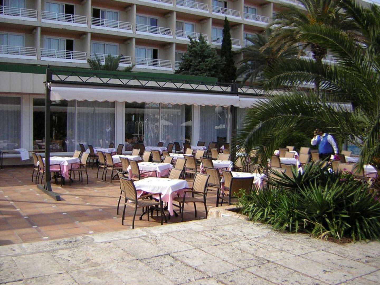 Auf der Außenterrasse konnte man Frühstücken aber auch Abendessen. Keine Tischreservierung möglich. Mit Sonnenmarkisen ausgestattet. Zugang über einen Speisesaal zum Buffet schnell zu erreichen.