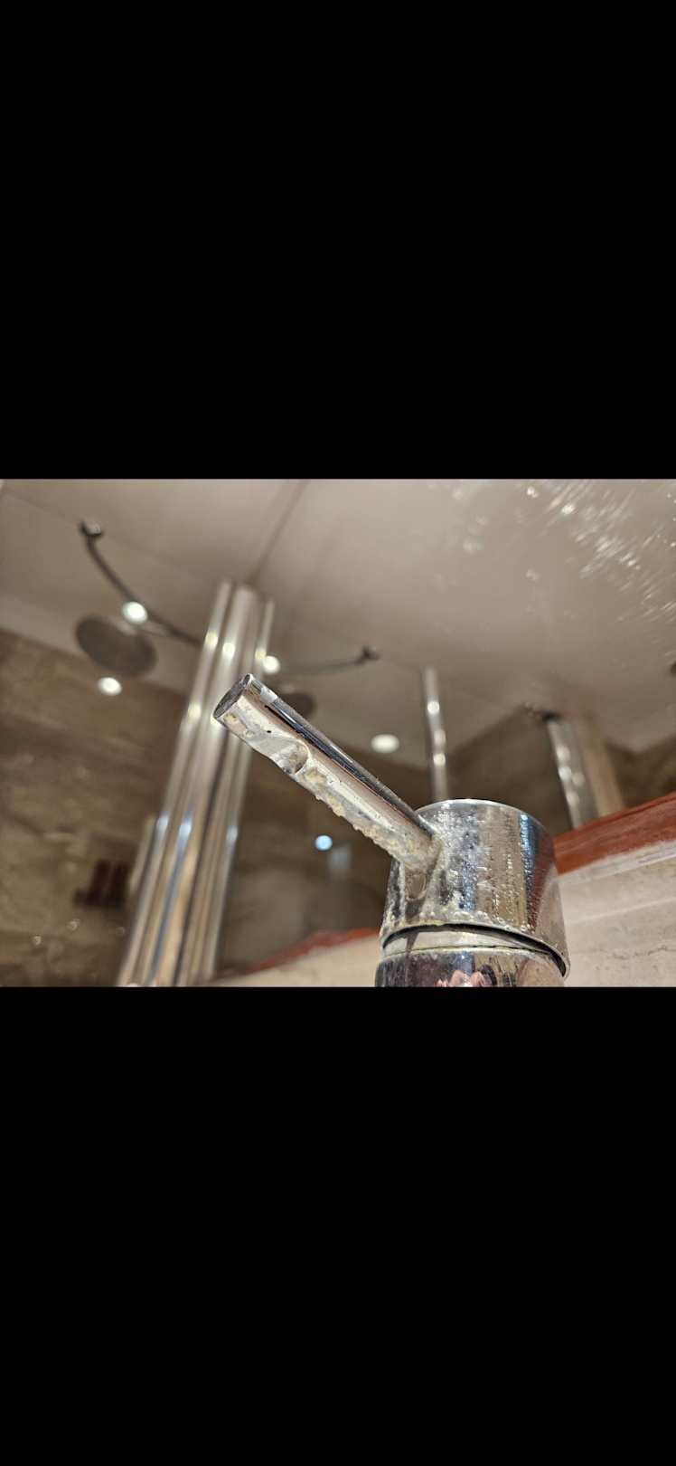 Verkalkter Wasserhahn, das Wasser sprudelt in alle Richtungen
