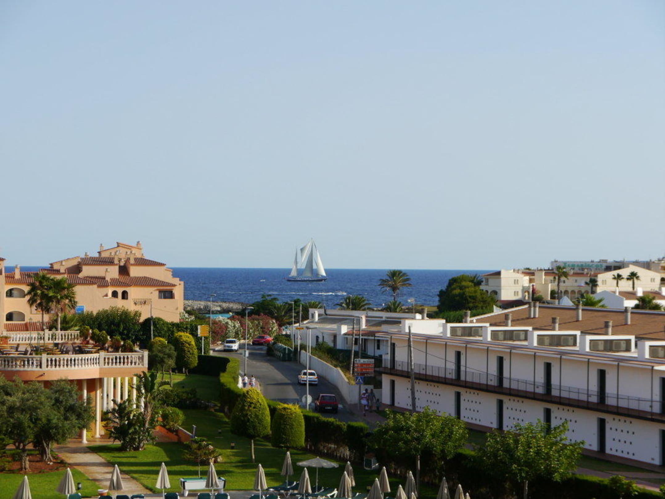 Dies ist zugleich auch die Poolseite. Man sieht auch die recht geschäftige Straße, auf der praktisch alles in den Ort fährt, was aus Richtiung Cuitadella (und damit der wichtigsten Inselstraße) kommt.