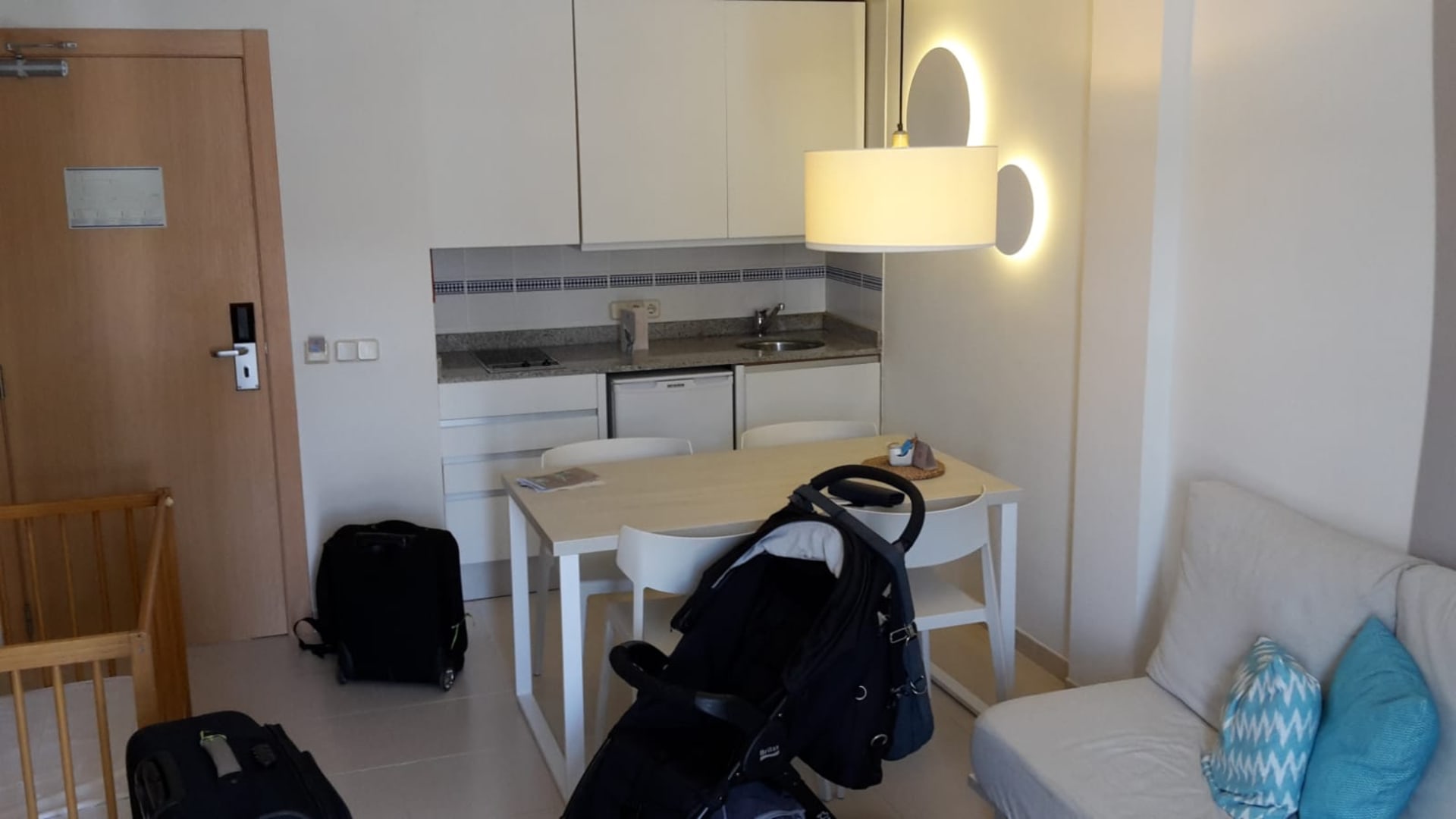 ZimmerKomplett eingerichtete Küchenzeile inkl. Mikrowelle, Wasserkocher und Kaffeemaschine. Nur das Spülmittel muss man selber mitbringen. 😉