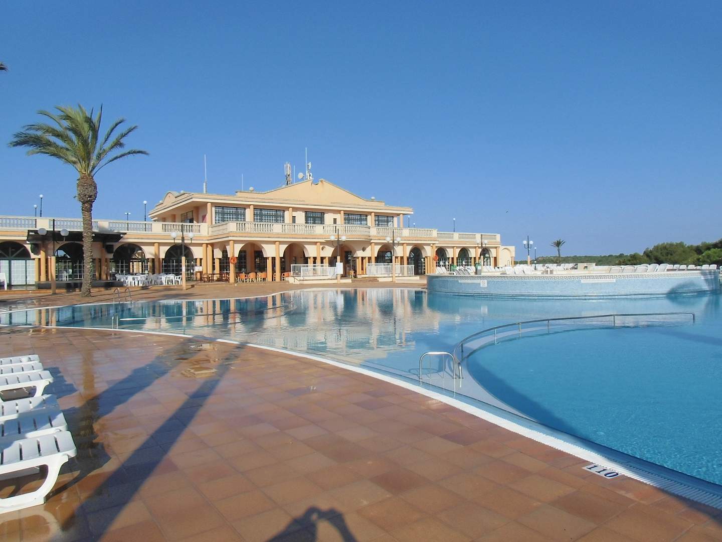 Großer PoolBild am frühen Morgen mit Blick auf das Haupthaus. Noch sind alle Liegen frei. Nach dem Frühstück waren alle Liegen reserviert.