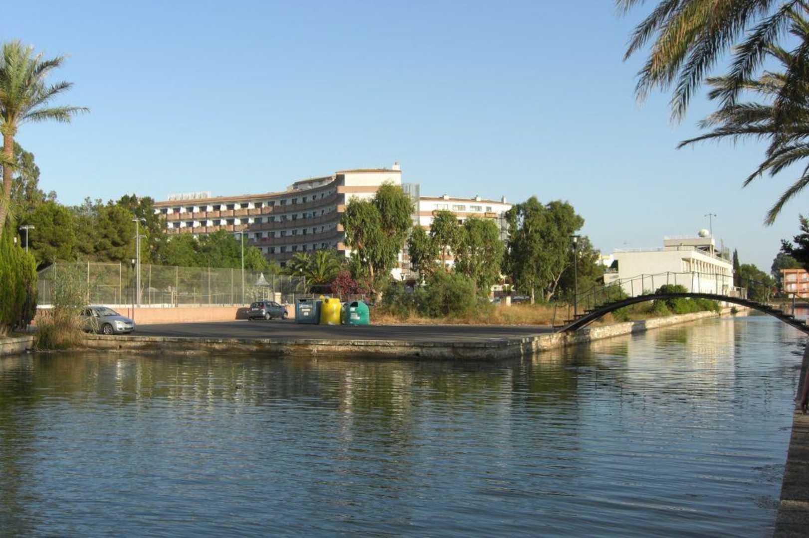 das Bild zeigt eine Rückansicht vom Grupotel Maritimo samt Kanal. diese Kanal/Seenlandschaft zieht sich durch ganz Alcudia westlich der Hauptsrasse an vielen Hotelkomplexen vorbei.