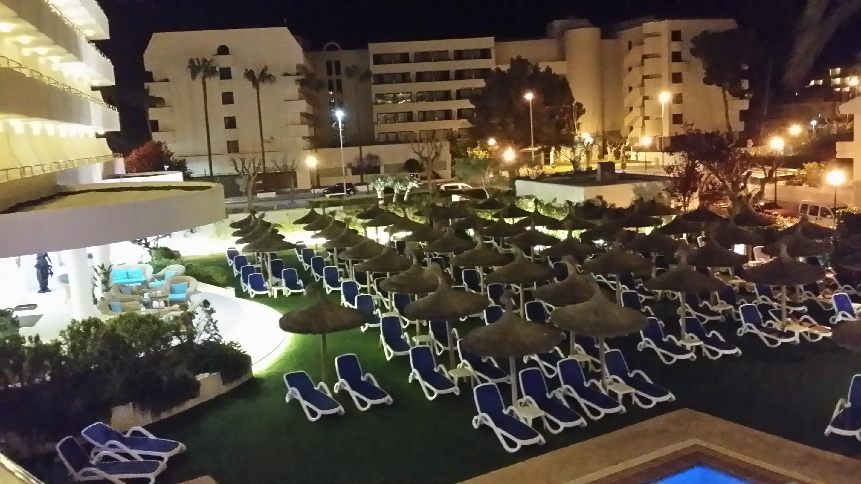 Blick vom Balkon erster Stock auf die Poolanlage. Nachts.