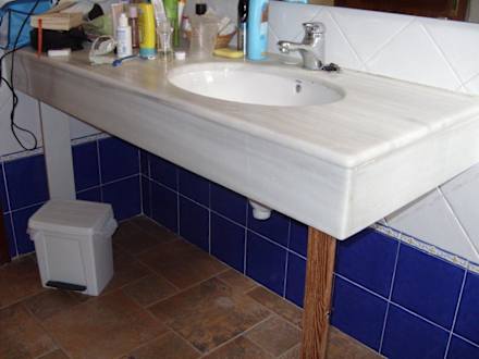 WaschtischDer Waschtisch musste provisorisch mit einer Holzlatte abgestützt werden, damit er nicht von der Wand fällt.