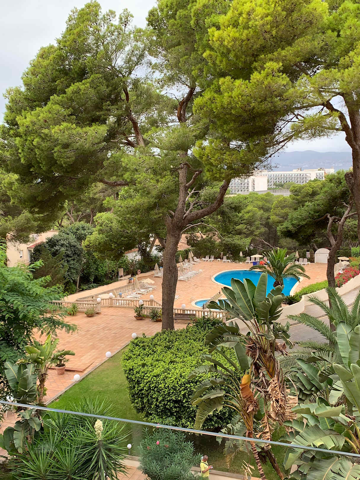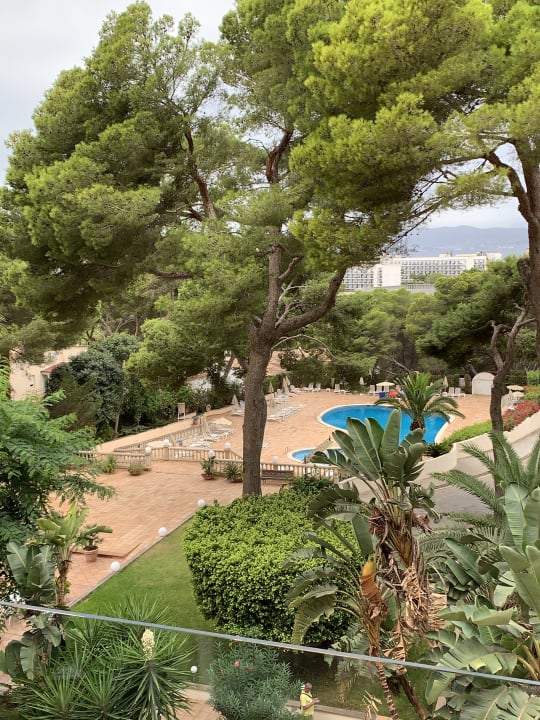 Blick vom Balkon des Zimmers im 4. Stock. Über den Garten zum Pool bis hin zum Meer.